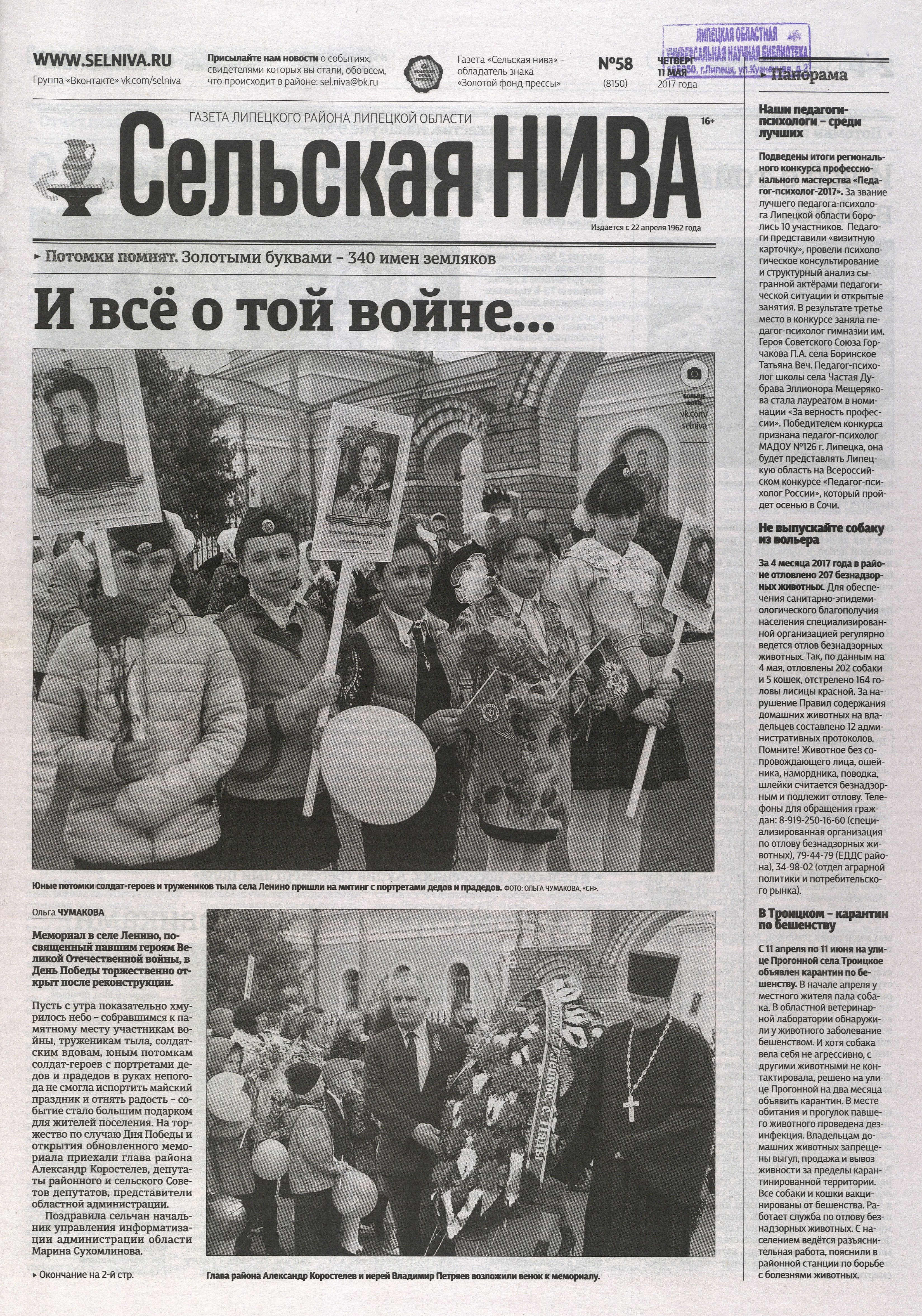 - Чумакова О. И все о той войне... : мемориал в селе Ленино, посвященный павшим героям Великой Отечественной войны, в День Победы торжественно открыт после реконструкции // Сельская нива [Липецкий район]. – 2017. – 11 мая. – С. 1, 2 : фот. Продолжение С. 2.