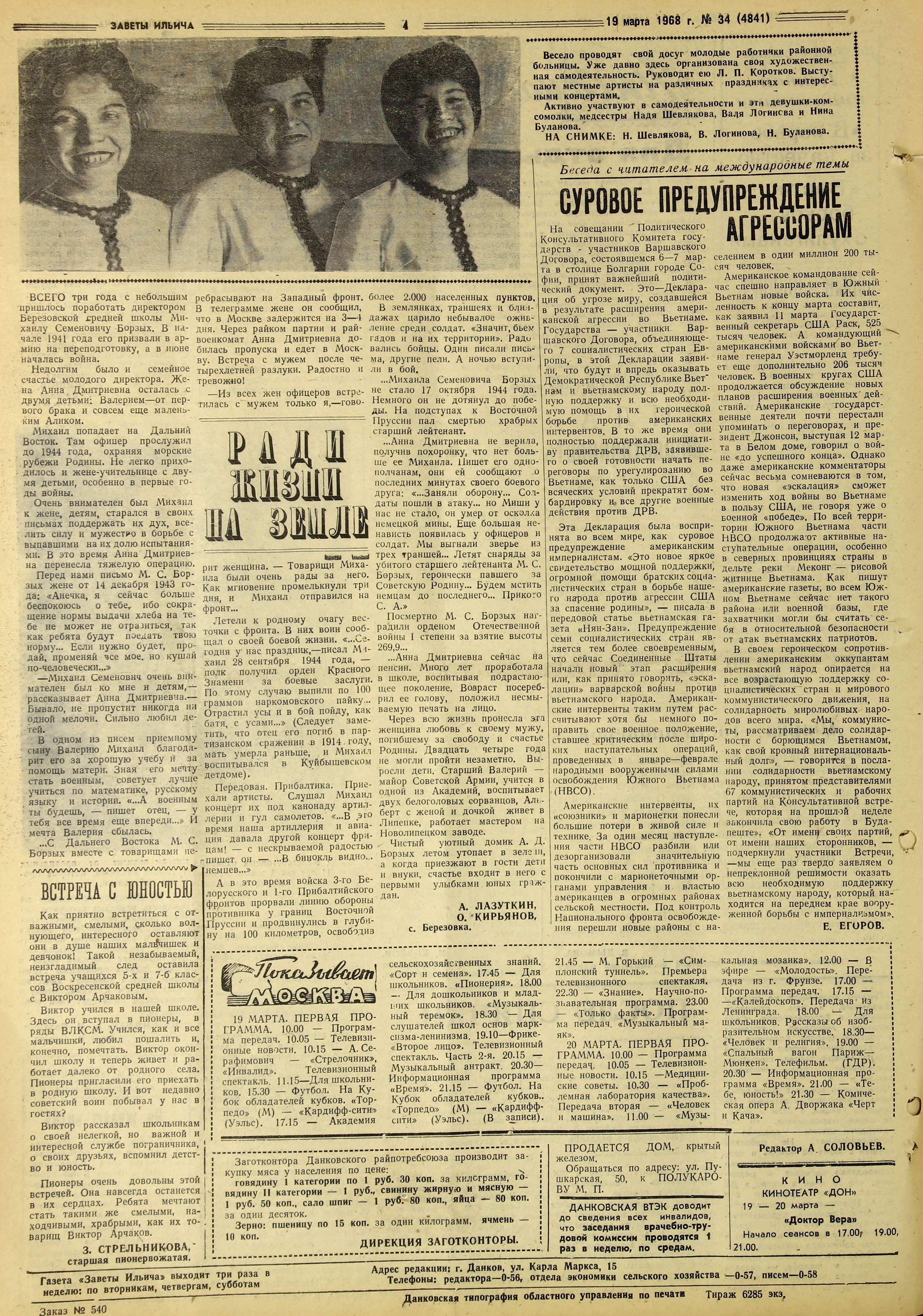 Источник: Лазуткин А., Кирьянов О. Ради жизни на земле. // Заветы Ильича. – 1968. – 19 марта. – С. 4.