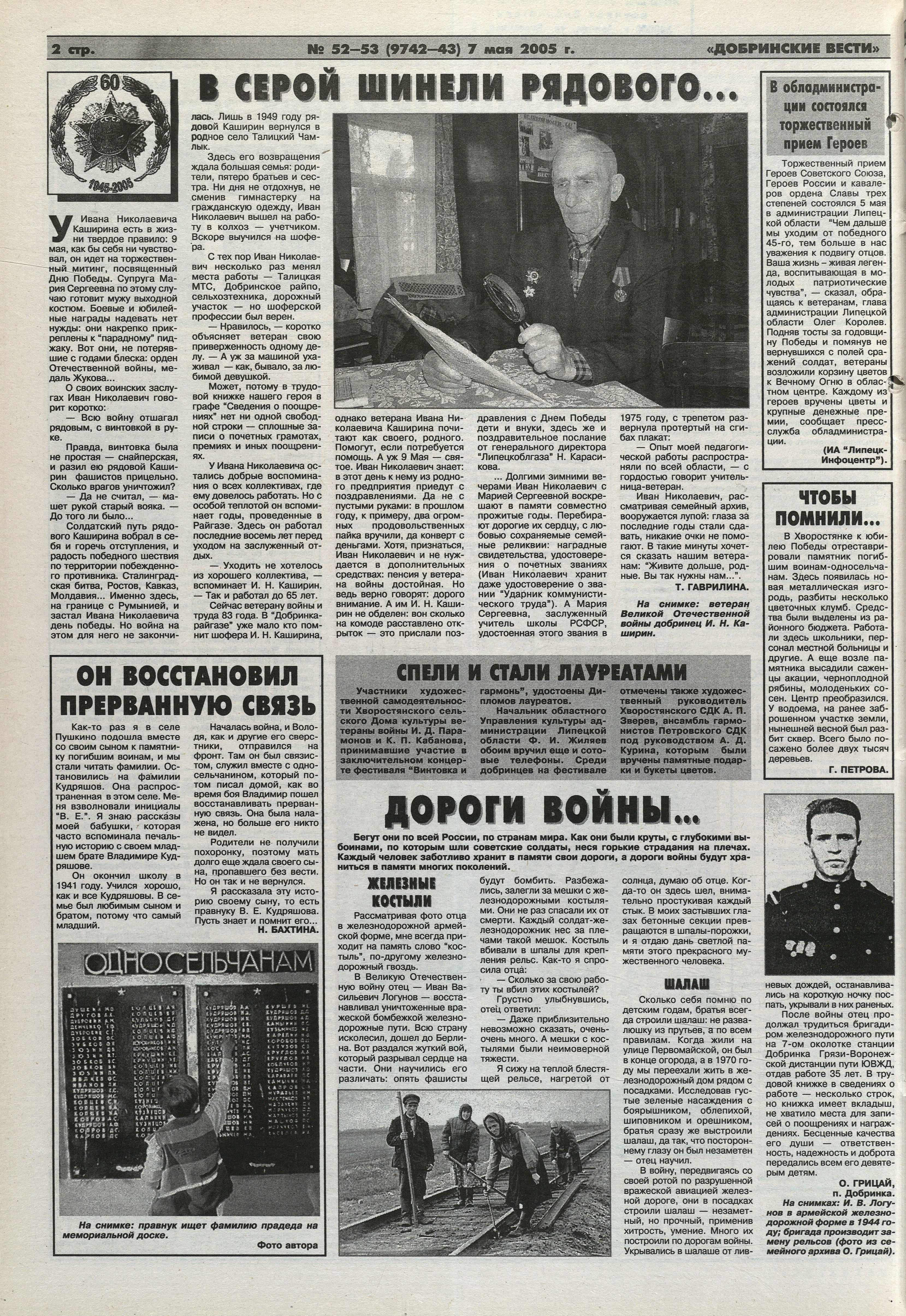 Источник: Гаврилина Т. В серой шинели рядового... // Добринские вести. – 2005. – 7 мая. – С. 2.