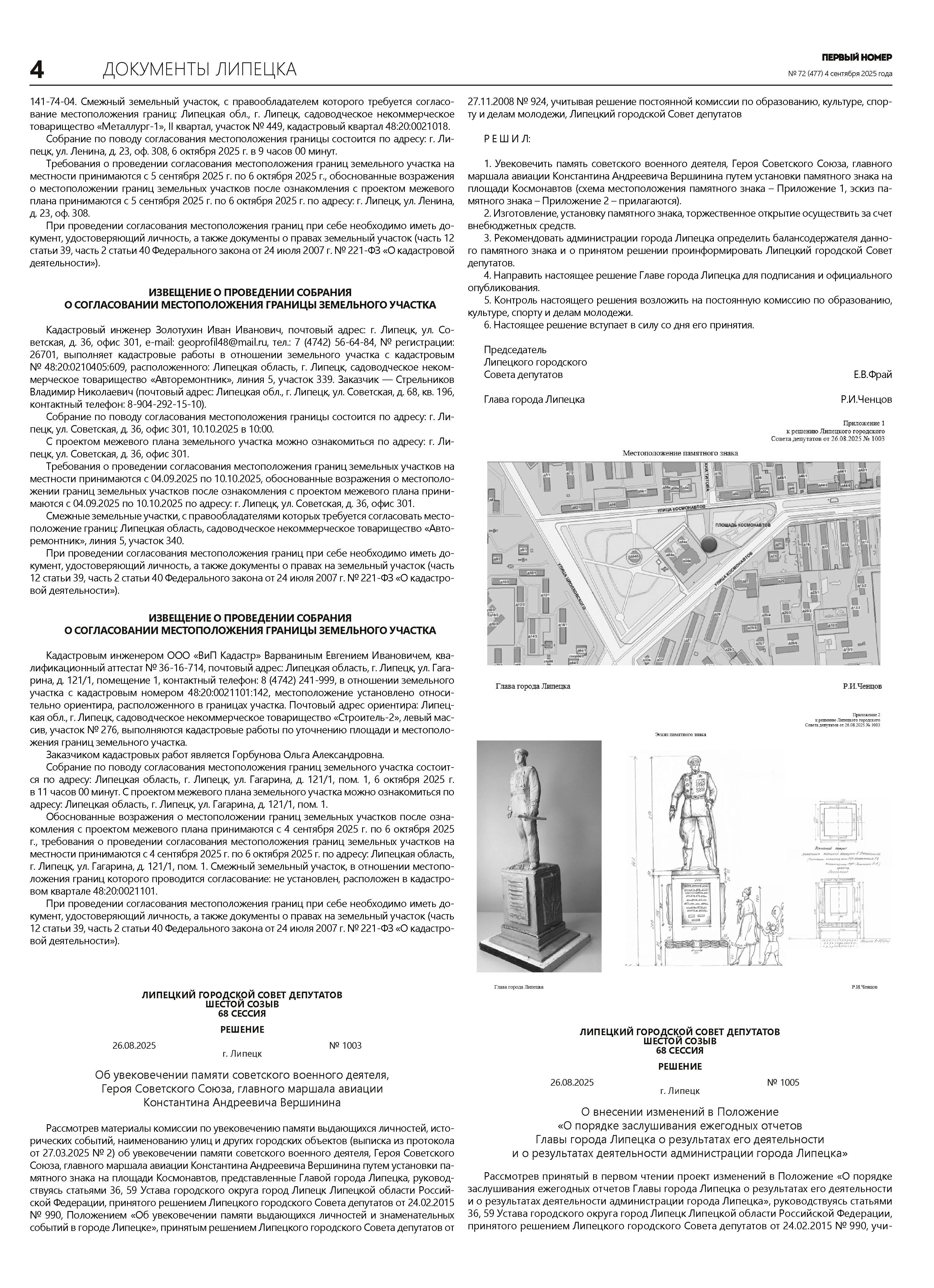 - Об увековечении памяти советского военного деятеля, Героя Советского Союза, главного маршала авиации Константина Андреевича Вершинина : [путем установки памятного знака на площади Космонавтов] : решение Липецкого городского Совета депутатов 68-й сессии 6-го созыва № 1003 от 26.08.2025 // Первый номер официально. – 2025. – 4 сент. (№ 72) – С. 4.