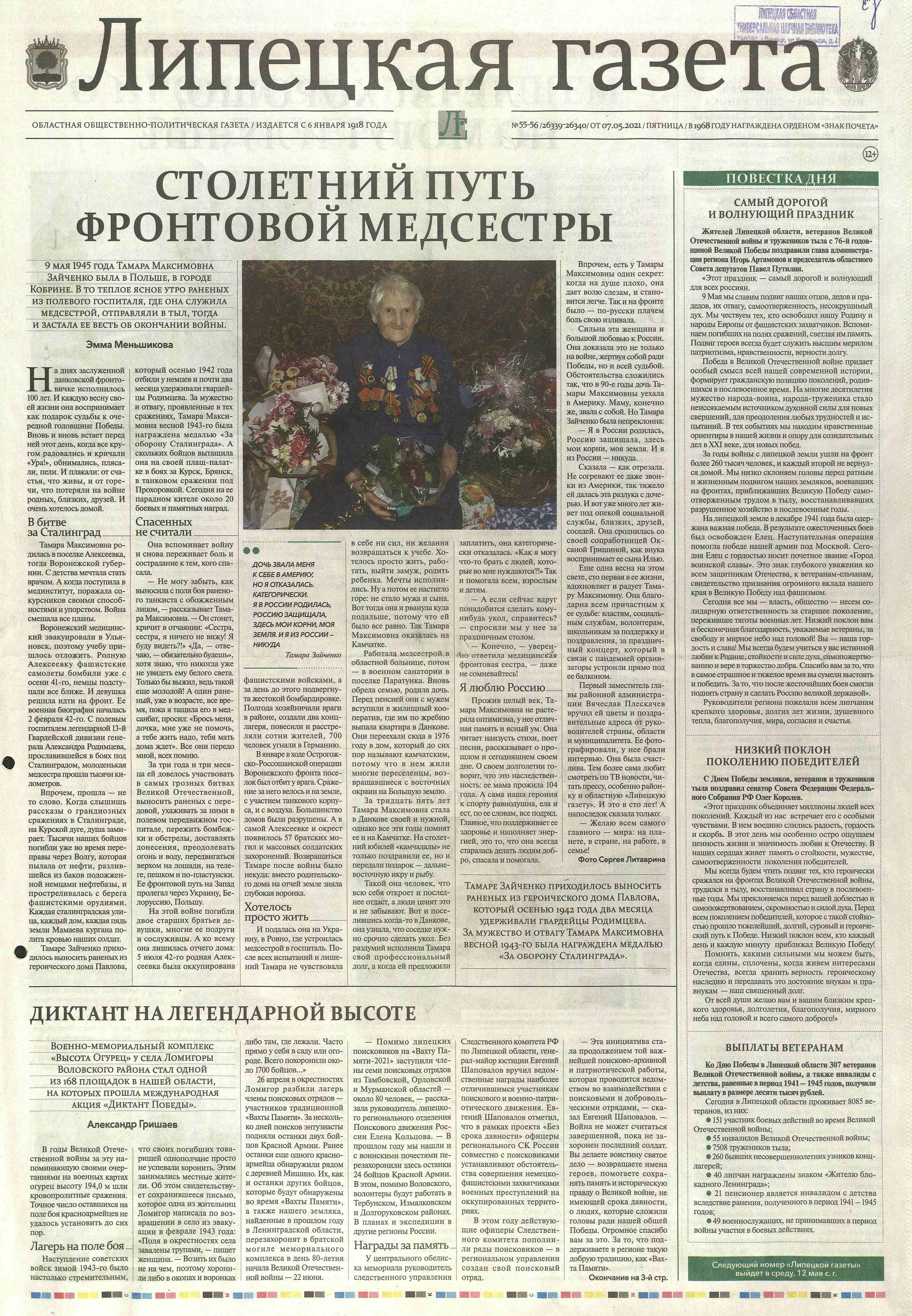 Источник: Меньшикова Э. Столетний путь фронтовой медсестры / фот. С. Литаврин // Липецкая газета. – 2021. – 7 мая. – С. 1.